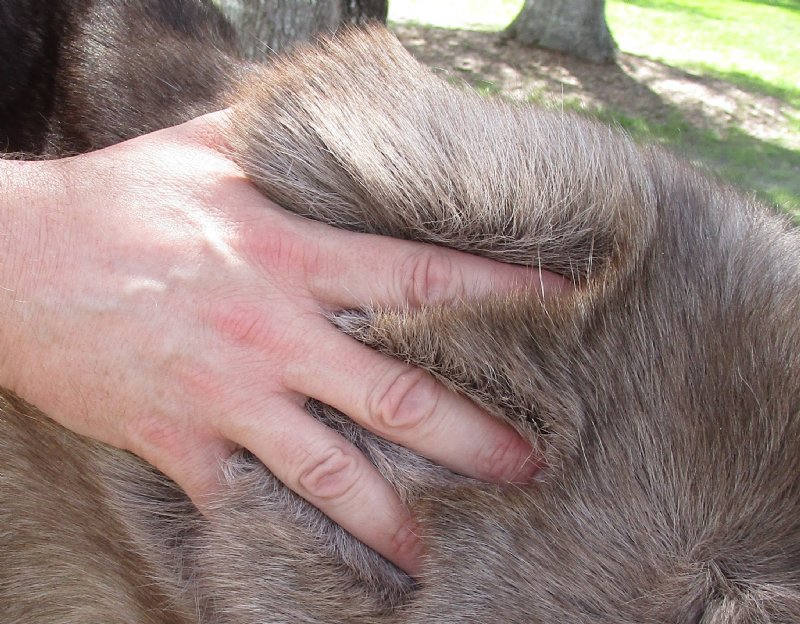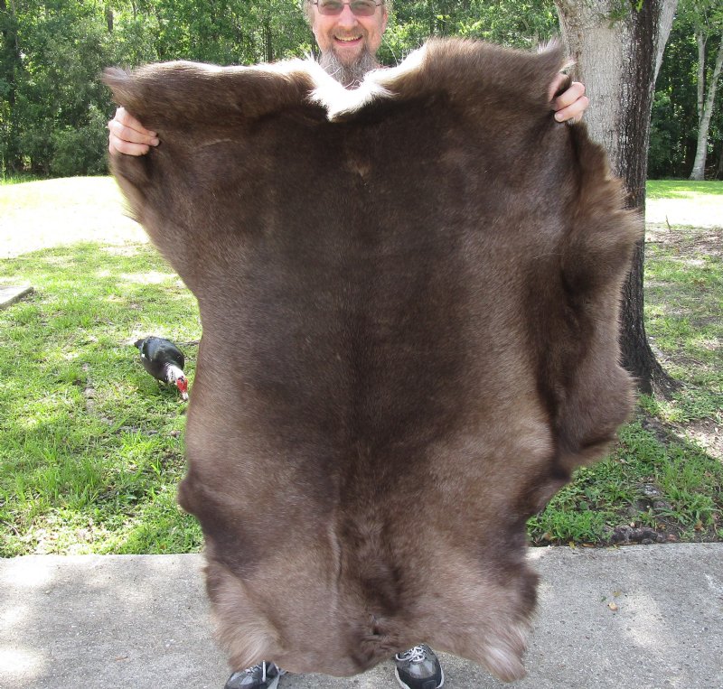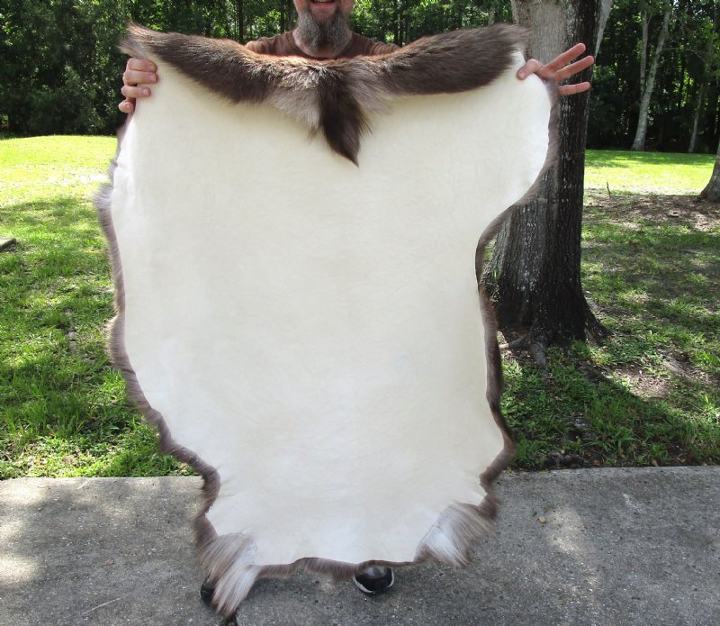 Grade B Reindeer hide, reindeer skin without legs imported from Finland, farm raised for food.  This hide measures approximately 45 inches long and 34 inches wide.  Review all photos. This reindeer fur without legs is professionally tanned and imported from Finland.  The legs have been trimmed off. This reindeer hide without legs is a natural and comfortable product and looks great as a wall decoration in a cabin or den, as furniture throws or decorative rugs but should not be walked or stepped on, to prevent shedding and breaking of the fur.  Reindeer skins and hides should be cleaned once a year with a standard vacuum on the lowest power.