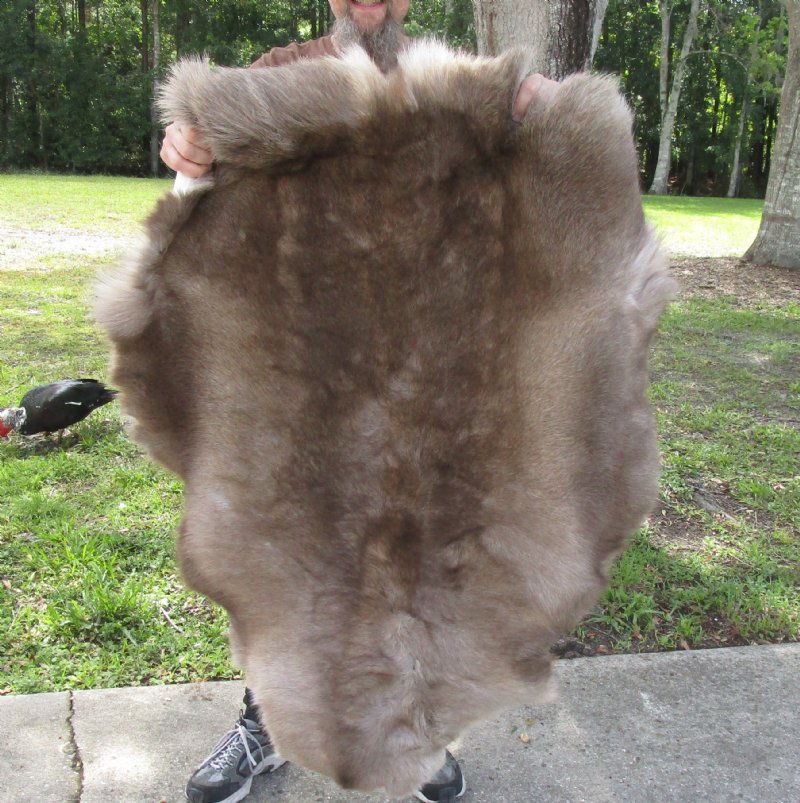 Grade B Reindeer hide, reindeer skin without legs imported from Finland, farm raised for food.  This hide measures approximately 47 inches long and 33 inches wide.  Hole - Review all photos. This reindeer fur without legs is professionally tanned and imported from Finland.  The legs have been trimmed off. This reindeer hide without legs is a natural and comfortable product and looks great as a wall decoration in a cabin or den, as furniture throws or decorative rugs but should not be walked or stepped on, to prevent shedding and breaking of the fur.  Reindeer skins and hides should be cleaned once a year with a standard vacuum on the lowest power.