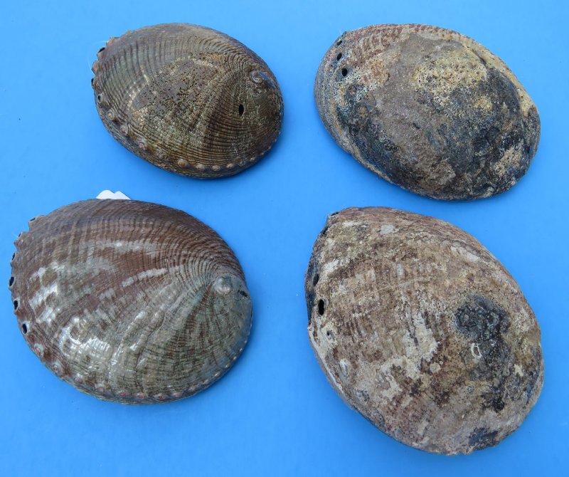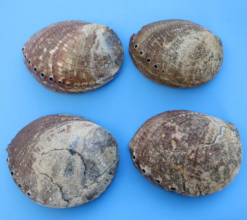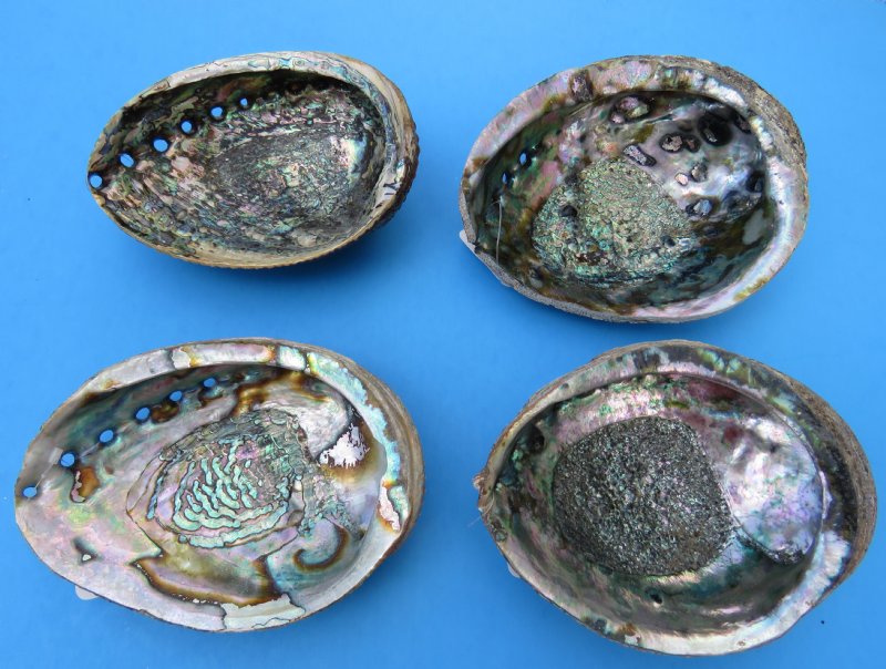 Wholesale abalone shells, commercial grade, sage smudge bowls and smudging shell and some have a light sealant on the shells, of the Haliotidae family of green abalone from 6-1/2 inches long to approximately 7-1/4 inches long are colorful seashells to add to a shell collection, and are used as abalone smudge bowls and smudging shells. The highly iridescent inner layer of the shell of abalone has traditionally been used as a decorative item in jewelry, buttons, and as inlay in furniture and in musical instruments such as guitars, etc. The shell is also polished and sold for seashell decorating and used in shell crafts and making inlaid knife handles, tables and jewelry. Abalone is a marine snail commonly called ear shell, sea ear, and ormer. Abalones live in warm areas of the Pacific Ocean, in the Indian Ocean, and on Europe's coasts. The shell is ear-shaped and has a row of three to nine small holes near one edge. It grows to a length of more than 12 inches . The shell is lined with an iridescent, pearl-like layer and is used to make mother-of-pearl buttons The abalone has a broad foot with which it attaches itself to submerged rocks. It feeds on algae and seaweed. There are about 100 species of abalones. The most common North American species are the black abalone, the green abalone, and the red abalone. They are found along the coast of California and Oregon. The abalone is harvested for its shell and edible foot from the ocean and from commercial farms that specialize in growing abalones. Abalones belong to the family Haliotidae.