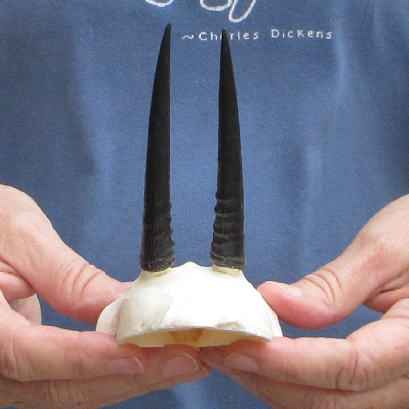 Grey Duiker Skull Plate (Sylvicapra grimmia) for sale with horns measuring approximately 3-3/4 inches long, measured around the curl of the horns. - Review all photos. This Grey Duiker skull plate with horns is from a wild African Grey Duiker and will have imperfections caused by the animal living in the wild and the natural aging process. Grey Duiker skull plate with horns are a great gift for skull collectors and collectors of weird and unusual items.