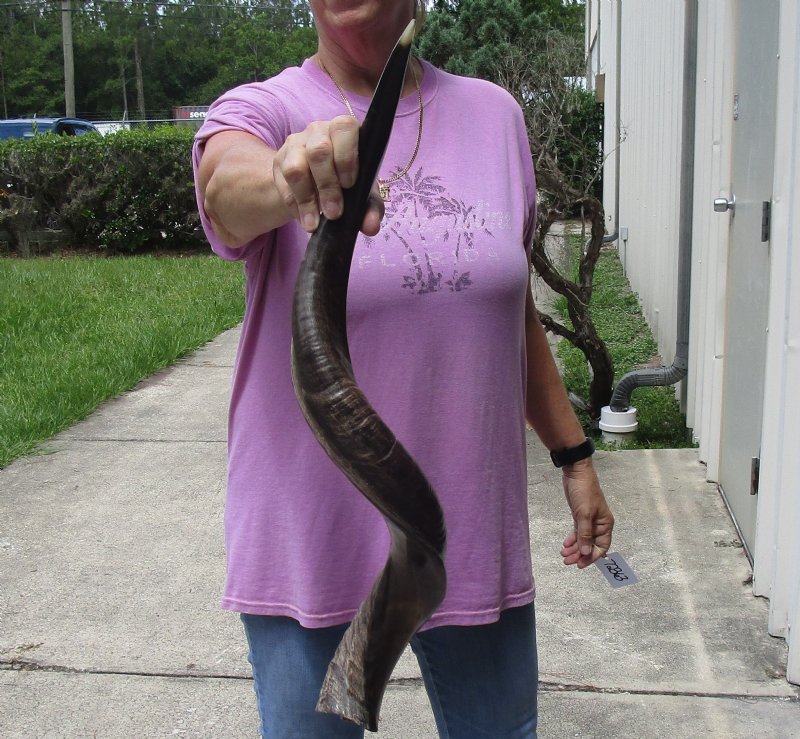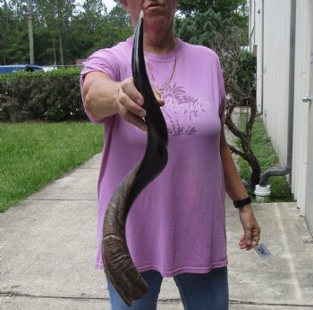 Half-Polished Kudu horn for sale (Tragelaphus strepsiceros / Greater Kudu) imported from South Africa, measuring approximately 30 inch, measured around the curl of the horn - not straight. The rough outer layer of the top of the horn has been buffed smooth with visible ridges and the underside of the horn has been polished to a shine -   review photos. Kudu horns are used in making shofars, blowing horns, kudu horn instruments, furniture legs, lamps, sconces, knife handles, cane handles, inlaid crafts and numerous other taxidermy crafts. Our African kudu horns are by-products of the farming industry and the African Government culling programs. The kudu horns have been professionally cleaned in Africa and cleared for entry into the United States by the U.S. Fish and Wildlife Service and U.S. Customs. We are direct importers of African wildlife products and have all Federal and State licenses.
