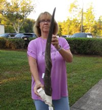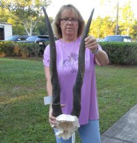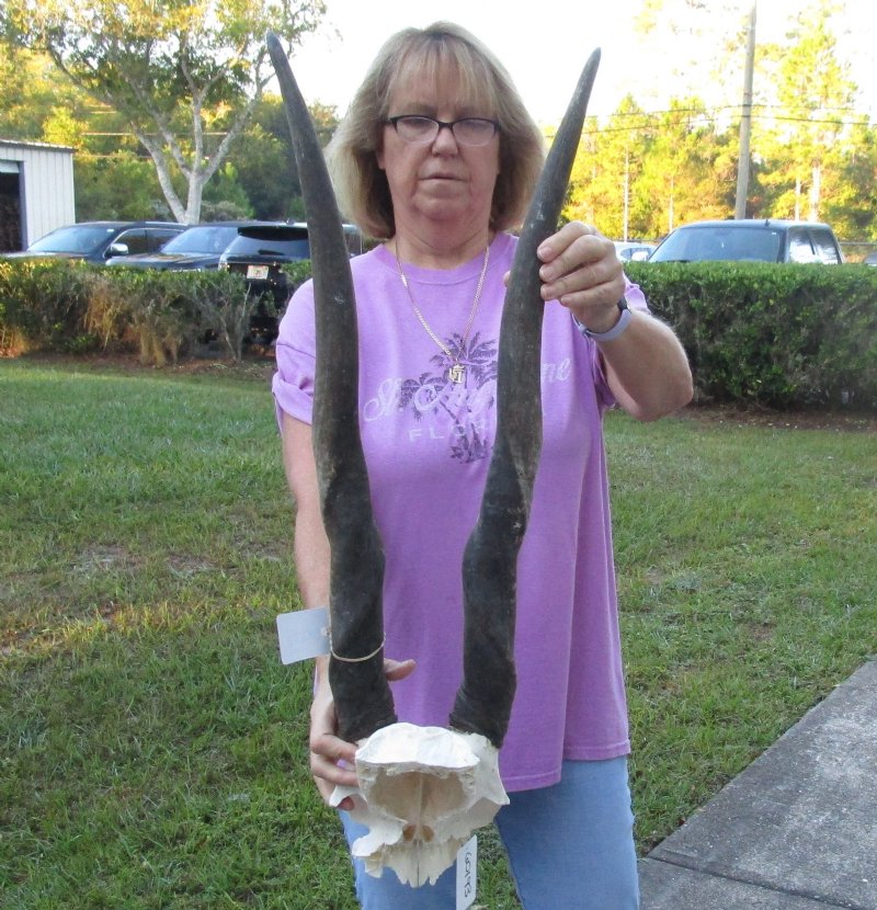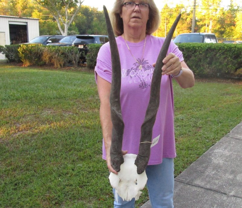 HUGE Female Eland (Taurotragus oryx) Skull Plate with 31 inch Horns for rustic cabin decor, measured around the curve of the horn. For rustic cabin decor.    Review photos. This Eland skull plate was imported from South Africa and obtained from the African government's culling program and the farming industry. Eland skulls are used in cabin and hunting lodge decorating as wall mounts over fireplaces and as wall accents. We are direct importers of African animal skulls and horns and animal products.