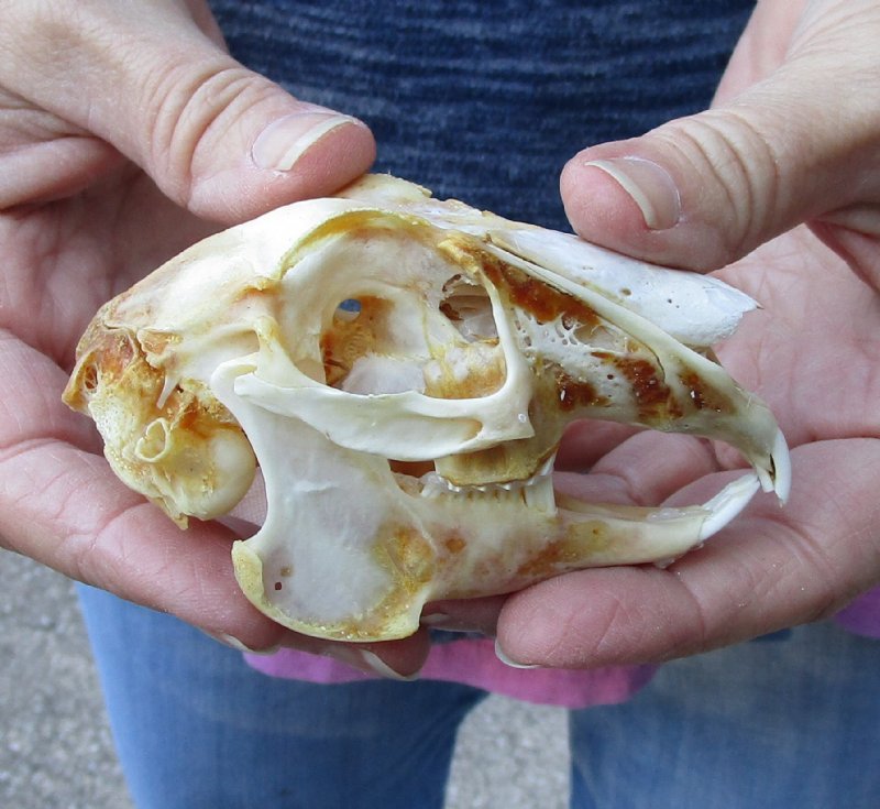Jack rabbit skull for sale (mouth glued shut with hot melt glue). Measuring 3-3/4 inches long by 1-3/4 inches wide. This jackrabbit skull, or jack rabbit skull, has been cleaned (but NOT whitened) and is ready for display. This skull is oily/discolored - review photos.  Jackrabbits are actually hares, not rabbits. Hares are larger than rabbits, and they typically have taller hind legs and longer ears. Jackrabbits were named for their ears, which initially caused some people to refer to them as "jackass rabbits."