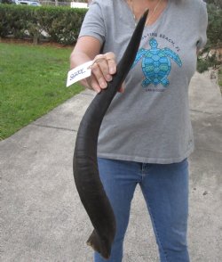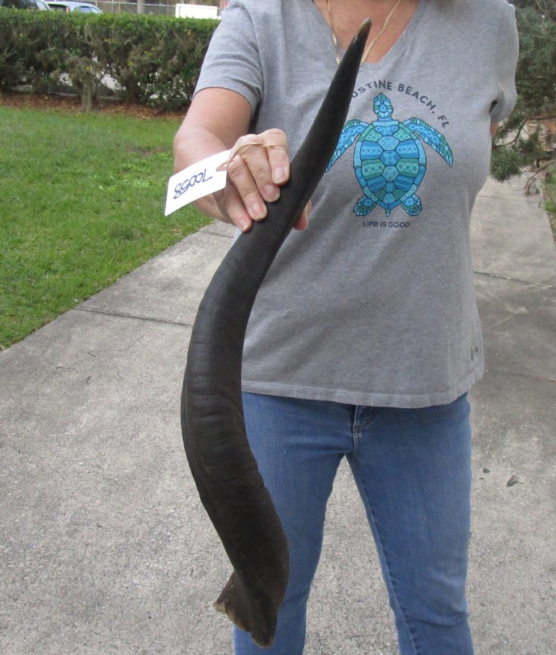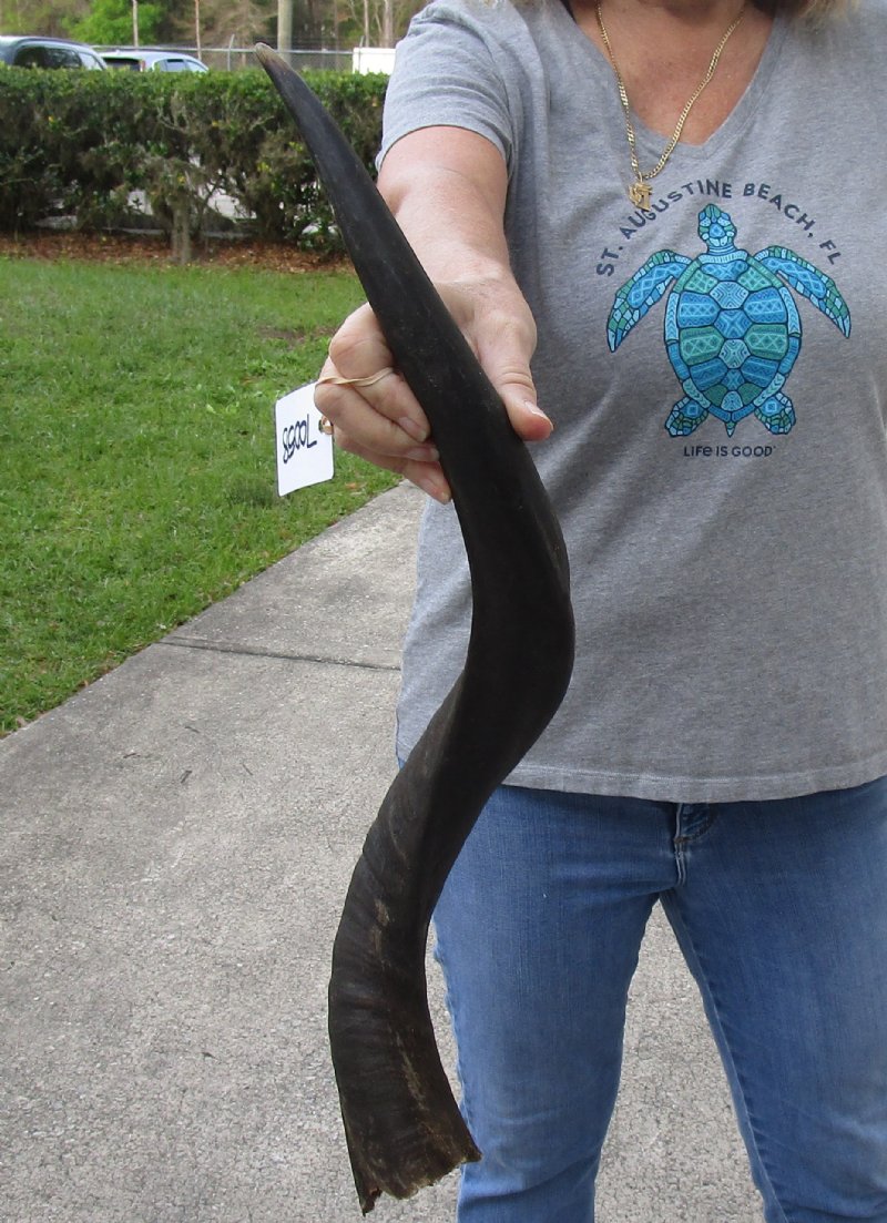 Kudu horn for sale (Tragelaphus angasi) imported from South Africa, measuring approximately 27 inch, measured around the curl of the horn - not straight. Review photos. Kudu horns are used in making shofars, blowing horns, kudu horn instruments, furniture legs, lamps, sconces, knife handles, cane handles, inlaid crafts and numerous other taxidermy crafts.