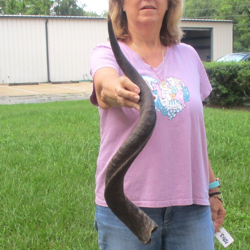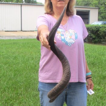 Kudu horn for sale (Tragelaphus angasi) imported from South Africa, measuring approximately 31-1/2 inch, measured around the curl of the horn - not straight. Frayed at base of horn. Review photos. Kudu horns are used in making blowing horns, kudu horn instruments, furniture legs, lamps, sconces, knife handles, cane handles, inlaid crafts and numerous other taxidermy crafts.