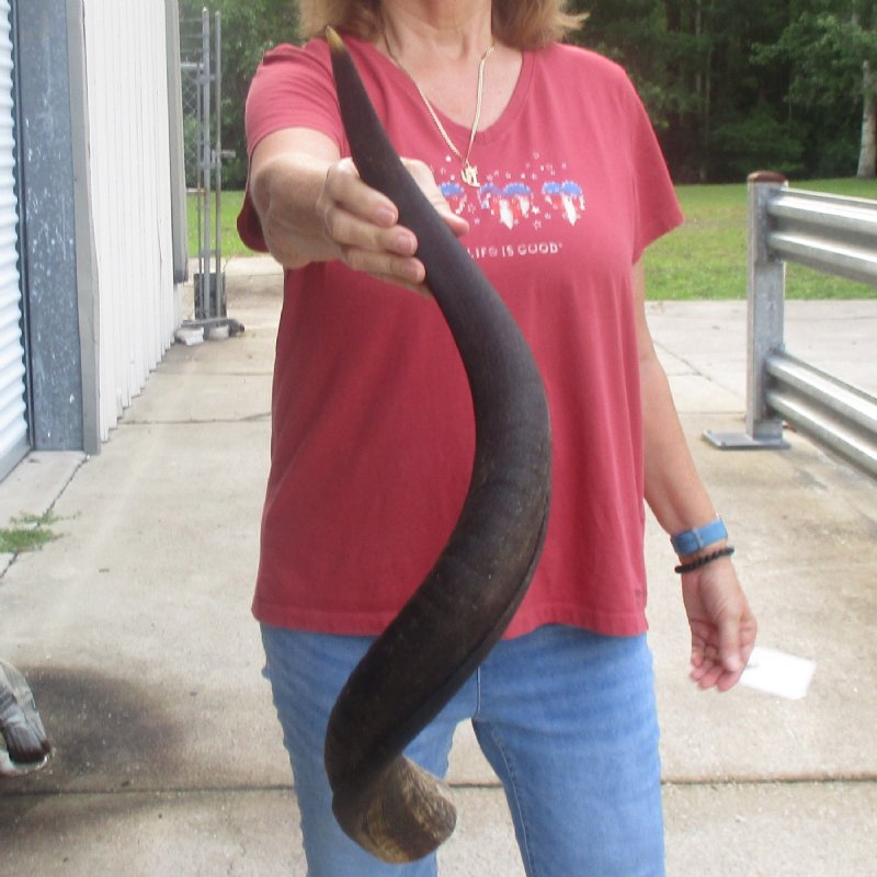 Kudu horn for sale (Tragelaphus angasi) imported from South Africa, measuring approximately 33 inch, measured around the curl of the horn - not straight. Review photos. Kudu horns are used in making shofars, blowing horns, kudu horn instruments, furniture legs, lamps, sconces, knife handles, cane handles, inlaid crafts and numerous other taxidermy crafts.