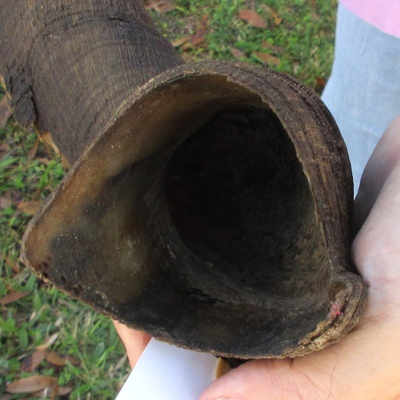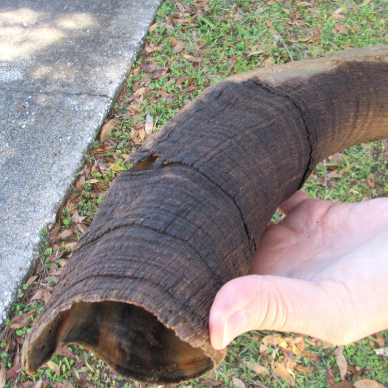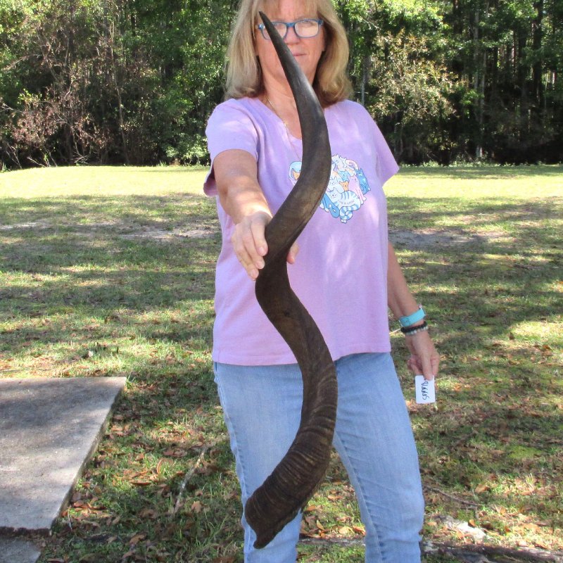 Kudu horn for sale (Tragelaphus angasi) imported from South Africa, measuring approximately 45 inch, measured around the curl of the horn - not straight.  - Gouge on horn and split with some fraying. Review photos. Kudu horns are used in making shofars, blowing horns, kudu horn instruments, furniture legs, lamps, sconces, knife handles, cane handles, inlaid crafts and numerous other taxidermy crafts.