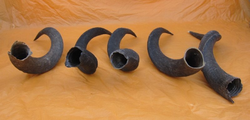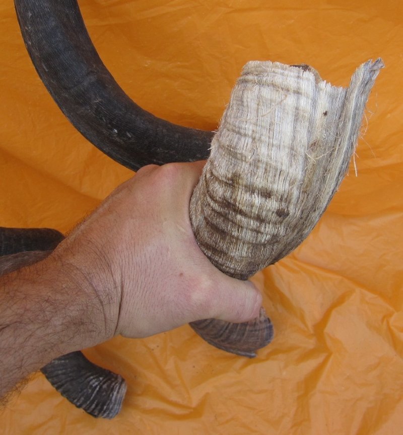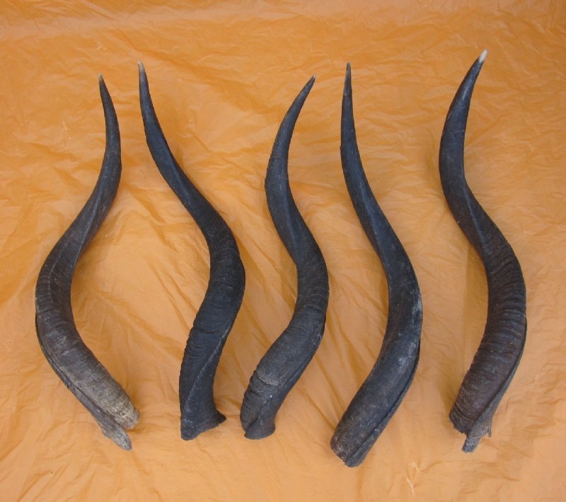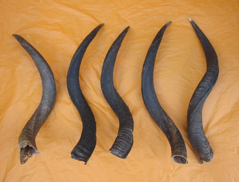 Wholesale African Kudu Horns for sale from 25 inches to 29 inches, measured around the curl of the horns.  Kudu horns are measured around the curve of the horn using a cloth tape measure --Not Straight with a wood ruler. Kudu horns are used to make shofars or blowing horns, sconces, lamps, furniture legs, knife handles and cane handles, and in numerous other taxidermy crafts. All our kudu horns are from a wild African kudu and will have natural imperfections caused by aging, fighting and living in the wild.