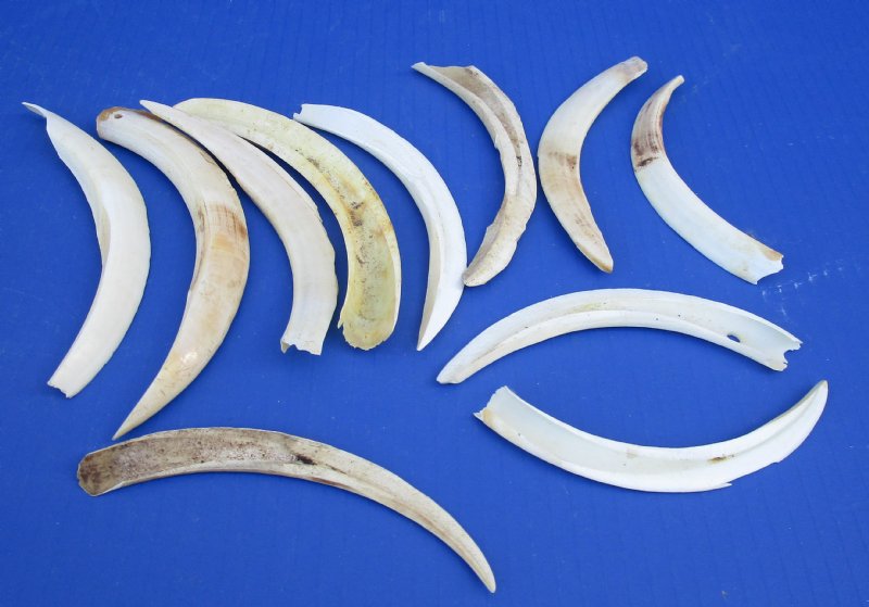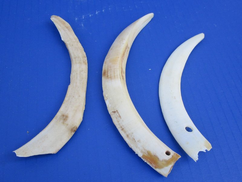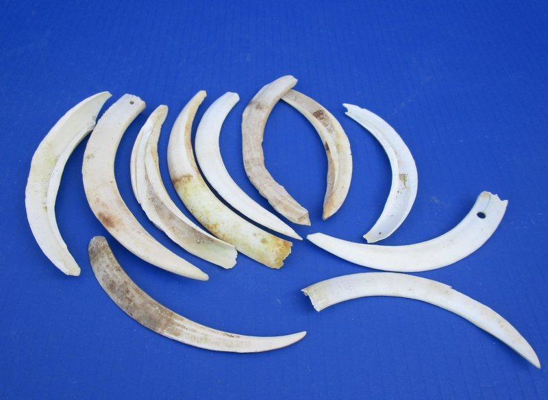 Lower split warthog tusks, wholesale ivory for carving (all of these tusk are split, dirty and some may have drill holes) measuring between approximately 3 inches and 8 inches measured around the curve of the tusk using a cloth tape measure -- NOT straight with a wood ruler.  The lower warthog tusks are much thinner and sharper than the upper tusks.  Warthog tusks and warthog ivory is used for making knife handles, carving, making warthog handles for walking canes and for numerous taxidermy craft projects. Warthogs got their names from the bumps on their faces that look like warts. They also each have four tusks, two on each side of their snouts. The upper tusks are longer and curve toward each other. Warthogs are pigs that live in Africa south of the Sahara.