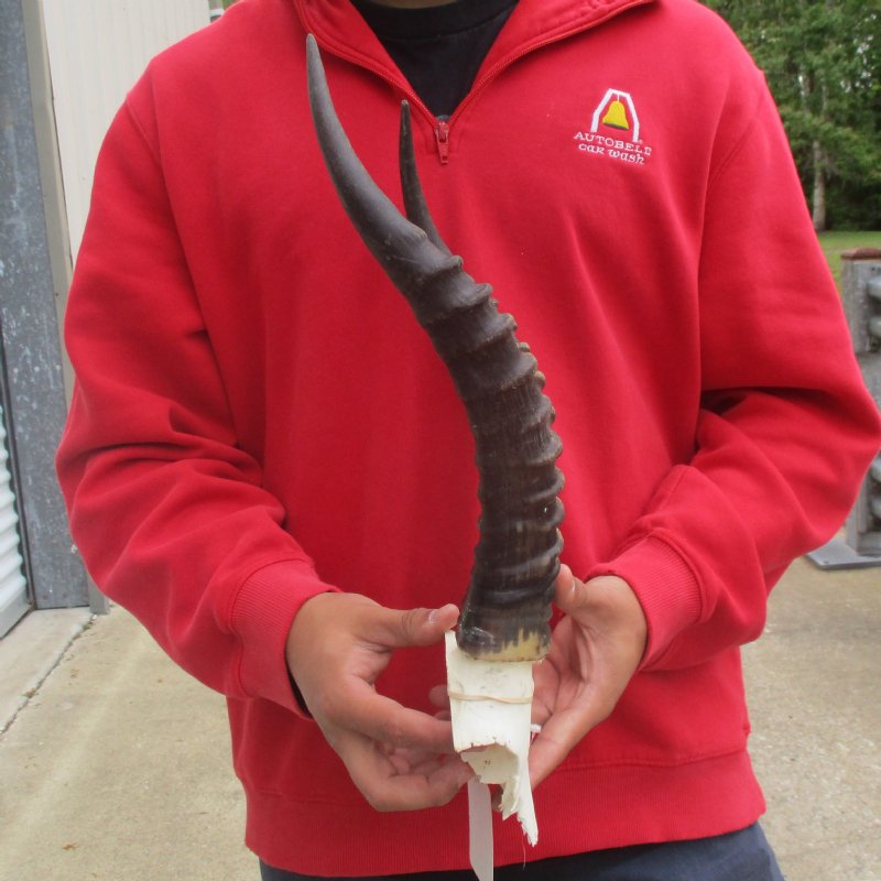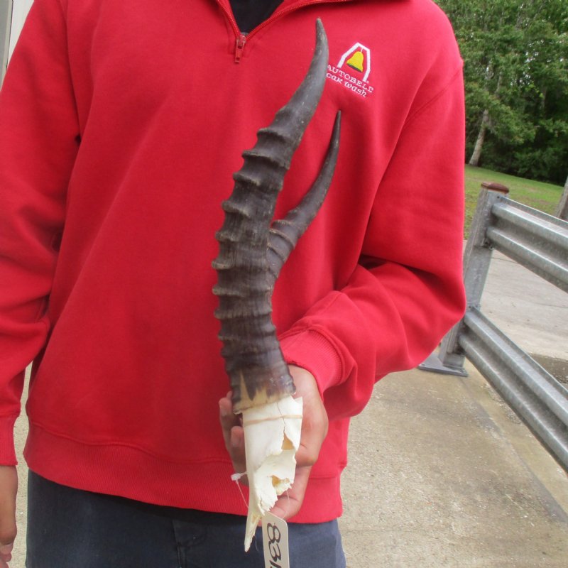 Male Blesbok Skull Plate (Damaliscus dorcas phillipsi) for sale with horns measuring approximately 15 inches around the curve of the horns - not straight with a wood ruler.  - Review all photos. This is a real blesbok skull with horns and will have imperfections caused by the animal living and aging in the wild.