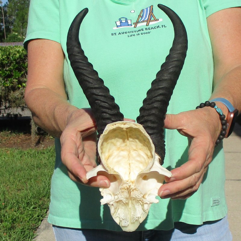 Male Springbok Skull Plate with Horns. The horns measure approximately 10 inches, measured around the curve of the horns and are on a Springbok skull plate.  Review photos.  The skull plate with horns is from a wild African Springbok and will have imperfections caused by the animal living in the wild and the natural aging process.