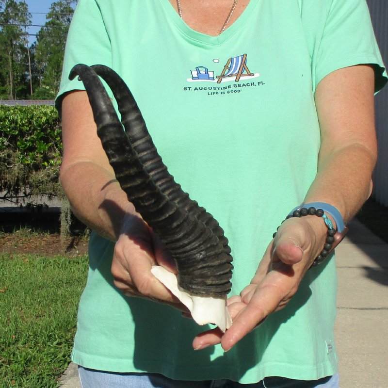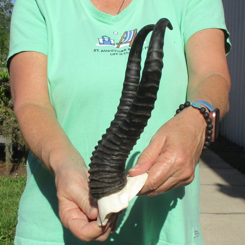 Male Springbok Skull Plate with Horns. The horns measure approximately 11-1/4 inches, measured around the curve of the horns and are on a Springbok skull plate.  Review photos.  The skull plate with horns is from a wild African Springbok and will have imperfections caused by the animal living in the wild and the natural aging process.