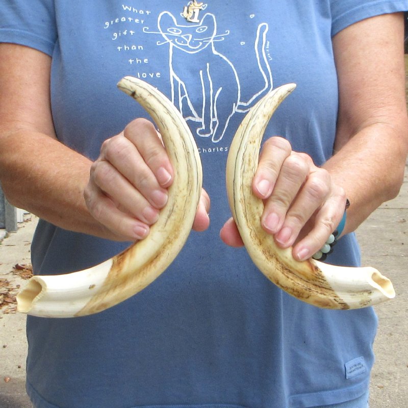 For Sale - Matching pair of 12 inch warthog tusks, warthog ivory. Warthog tusks and warthog ivory are measured around the curve of the tusk using a cloth tape measure - NOT straight using a wood ruler. Warthog tusks and warthog ivory are used for carving, making handles, in the art of scrimshaw and in taxidermy crafts.   -Review photos.