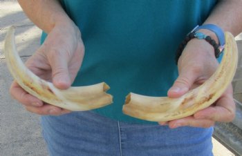 Matching pair of 8-1/2 inch warthog tusks, warthog ivory. Warthog tusks and warthog ivory are measured around the curve of the tusk using a cloth tape measure - NOT straight using a wood ruler. Warthog tusks and warthog ivory are used for carving, making handles, in the art of scrimshaw and in taxidermy crafts.