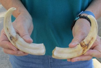 Matching pair of 8 inch warthog tusks, warthog ivory. Warthog tusks and warthog ivory are measured around the curve of the tusk using a cloth tape measure - NOT straight using a wood ruler. Warthog tusks and warthog ivory are used for carving, making handles, in the art of scrimshaw and in taxidermy crafts.