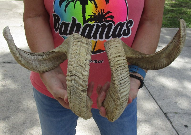 Matching Pair of B-Grade sheep (Ovis Aries) horns that measures approximately 27 inches in size. This is a damaged / discounted horns - These horns will have natural imperfections including gouges, holes, splits, missing sections of top layer, etc. from aging and fighting - review photos.  Sheep horns are measured around the curl of the horn - not straight.  Sheep horns are used in making blowing horns, furniture legs, lamps, sconces, knife handles, cane handles, inlaid crafts and numerous other taxidermy crafts. Our ram horns are a by-product of the farming industry and Government culling programs. Our ram horns are imported from India and South Africa.