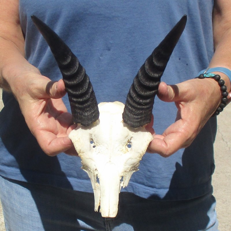 Mountain Reedbuck Skull Plate (Redunca fulvorufula) for sale with horns measuring approximately 7 inches, measured around the curl of the horns. - Review all photos. This Mountain Reedbuck skull plate is from a wild African Reedbuck and will have imperfections caused by the animal living in the wild and the natural aging process.