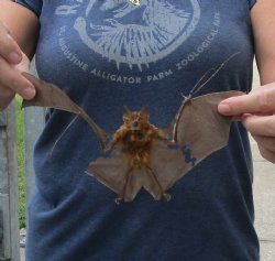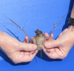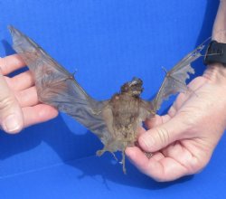 We have hand selected and photographed mummified, dried painted wooly bats and mummified fruit bats listed below for people who want to see exactly what they are buying.  All of them are ready for display or use in taxidermy crafts.  Some Fruit Bats are no more than 2 inches in length while others can be quite a bit larger. Some of them weigh only an ounce or two and others can weigh a few pounds. Fruit Bats have the best overall vision of all bat species. Fruit Bats come from Indonesia.