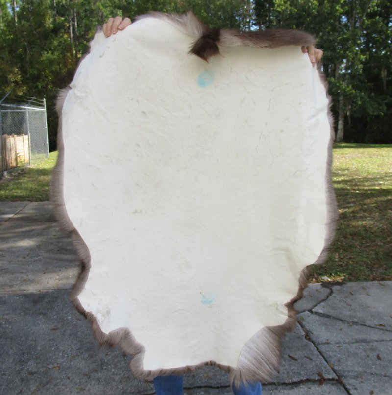 Nice Quality A Grade Reindeer hide, reindeer skin without legs imported from Finland, farm raised for food.  This hide measures approximately 47 inches long and 36 inches wide.  Review all photos. This reindeer fur without legs is professionally tanned and imported from Finland.  The legs have been trimmed off. This reindeer hide without legs is a natural and comfortable product and looks great as a wall decoration in a cabin or den, as furniture throws or decorative rugs but should not be walked or stepped on, to prevent shedding and breaking of the fur.  Reindeer skins and hides should be cleaned once a year with a standard vacuum on the lowest power.