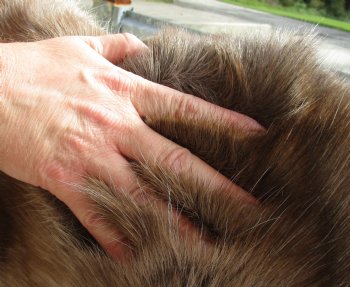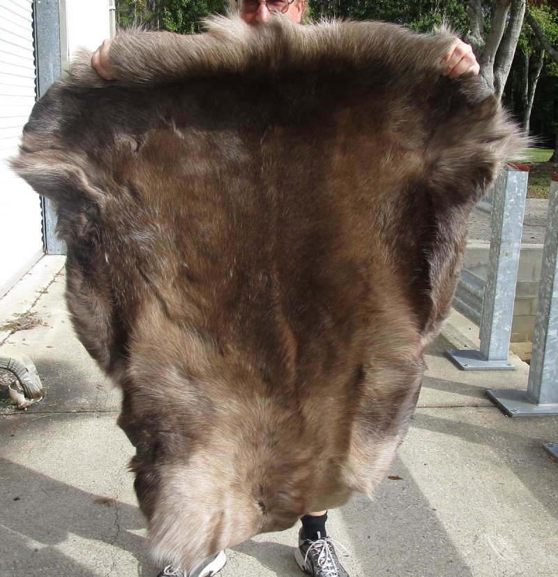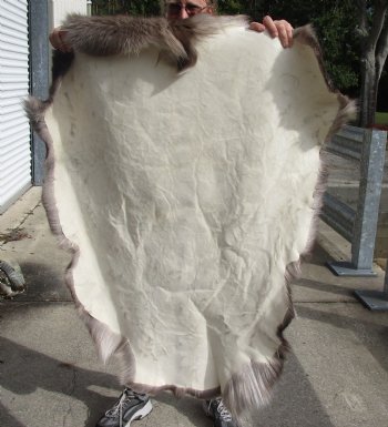 Nice Quality Reindeer hide, reindeer skin without legs imported from Finland, farm raised for food.  This hide measures approximately 46 inches long and 37 inches wide.  Review all photos. This reindeer fur without legs is professionally tanned and imported from Finland.  The legs have been trimmed off. This reindeer hide without legs is a natural and comfortable product and looks great as a wall decoration in a cabin or den, as furniture throws or decorative rugs but should not be walked or stepped on, to prevent shedding and breaking of the fur.  Reindeer skins and hides should be cleaned once a year with a standard vacuum on the lowest power.