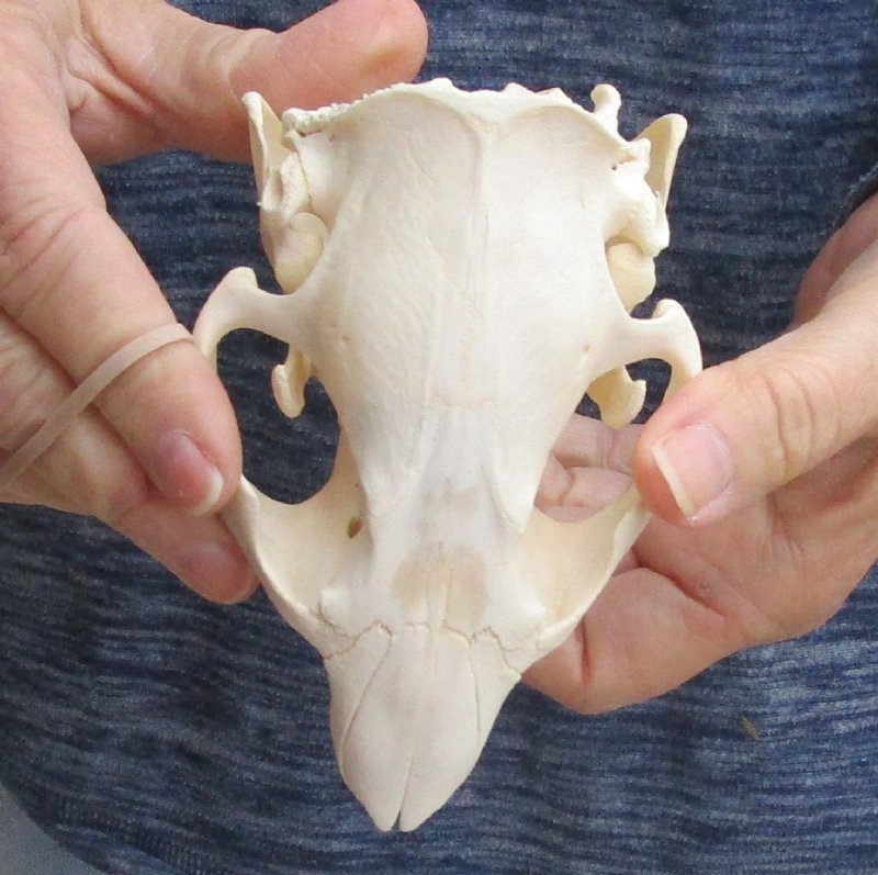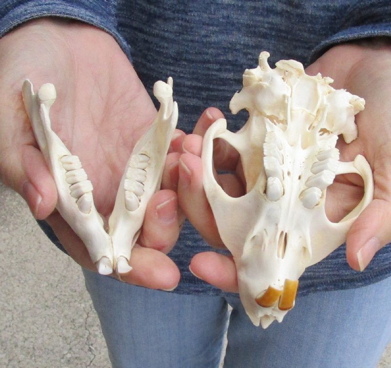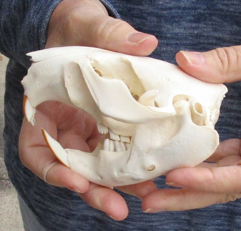 B-Grade North American Beaver skull (castor), a small animal skull measuring approximately 4-1/2 inches long and 3-1/4 inches wide.    B-Grade skulls may have missing or broken teeth, cracks, holes, or discoloration - review photos as this is the skull you will receive. This beaver skull is from a wild beaver and will have natural imperfections found on all wild animal skulls. Our beaver skulls have been cleaned and whitened; however, these skulls may have patches of discoloration.