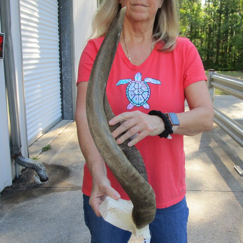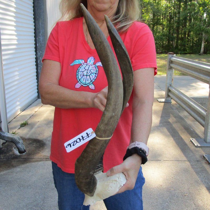 African Nyala Skull Plate (Tragelaphus angasii) for sale with horns that measure approximately 24 inches, measured around the curve of the horns. - Slight damage to horn tip. Review all photos. This African Nyala skull plate with horns has been professionally cleaned in South Africa and is ready for display as part of your rustic cabin decor. All our nyala skulls with horns are from the wild and will have imperfections normally found on all wild animal skulls and horns. Our African nyala animal skulls and horns are obtained from the farming industry and the African government culling program.