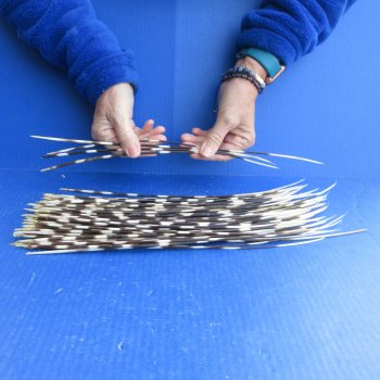 B-Grade 100 Semi-Cleaned Thin African porcupine quills (Hystrix africaeaustralis) measuring approximately 11 to 17 inches long.  These quills are dirty (semi cleaned) they will need to be cleaned and wiped down. The bundle may contain a few quills either below or above the size range you ordered.  The thickness will vary within the bundle also. African Porcupine quills are used in American Indian crafts. Quillwork is perhaps the oldest form of embroidery used by Native Americans. Quills were folded, twisted, wrapped, plaited and sewn using a wide range of techniques to decorate articles of clothing, bags, knife sheaths, baskets, wooden handles and pipe stems. Quillwork has been, and continues to be used to decorate the basketry of various Native American tribes.