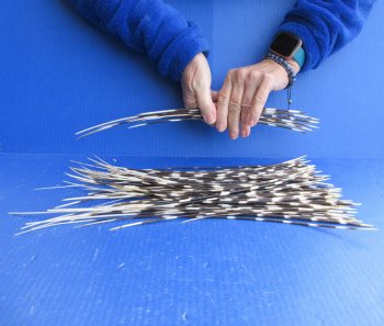 B-Grade 100 Semi-Cleaned Thin African porcupine quills (Hystrix africaeaustralis) measuring approximately 8 to 17 inches long.  These quills are dirty (semi cleaned) they will need to be cleaned and wiped down. The bundle may contain a few quills either below or above the size range you ordered.  The thickness will vary within the bundle also. African Porcupine quills are used in American Indian crafts. Quillwork is perhaps the oldest form of embroidery used by Native Americans. Quills were folded, twisted, wrapped, plaited and sewn using a wide range of techniques to decorate articles of clothing, bags, knife sheaths, baskets, wooden handles and pipe stems. Quillwork has been, and continues to be used to decorate the basketry of various Native American tribes.