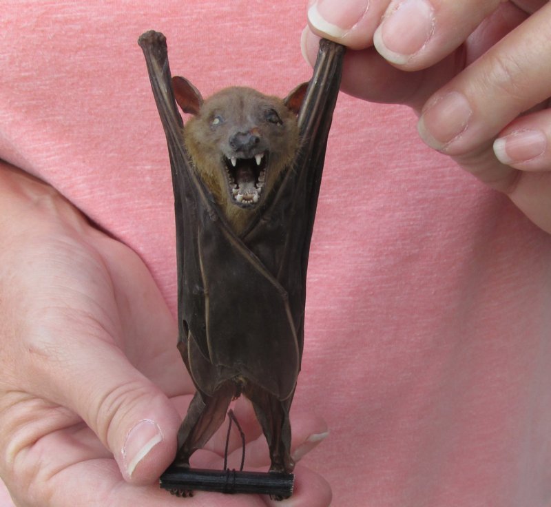 Wholesale Preserved hanging Minute fruit bat (Cynopterus minutus) measuring approximately 4-1/2 inches up to 5-1/2 inches long. These bats have a thread for hanging and are from Indonesia.
