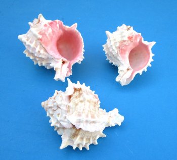 Wholesale small pink mouth murex shells, some with a slight shine for small hermit crabs, Phyllonotus erythrostomus, measuring  3 inches to 4 inches in size.  It is globe shaped, white or gray in color, with blunt spines covering the entire shell and has a glossy pale to bright pink interior.  These shells are perfect shells for hermit crab homes, making shell candles, as accents on seashell mirrors, wreaths, in baskets, in glass jars and in numerous shell art and shell craft projects.