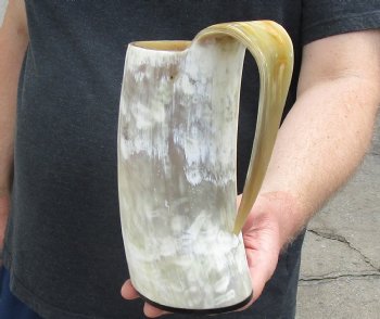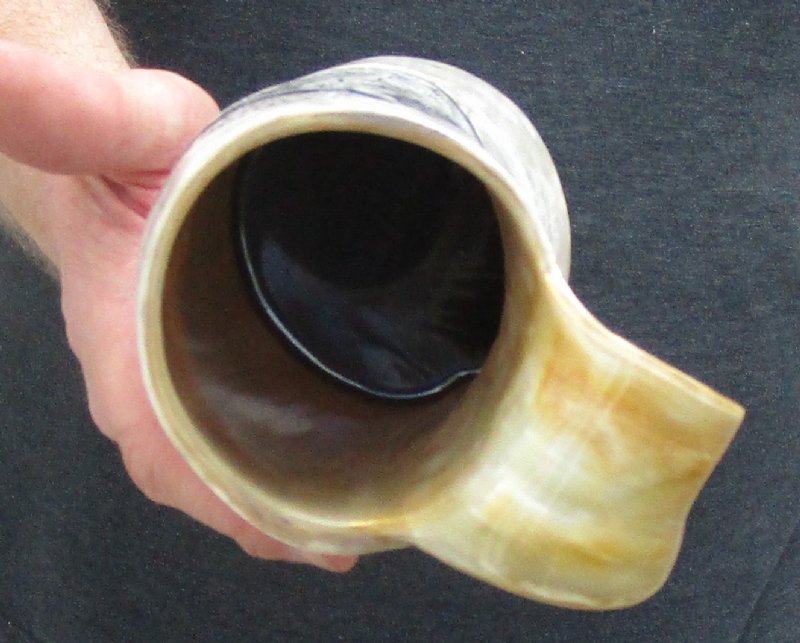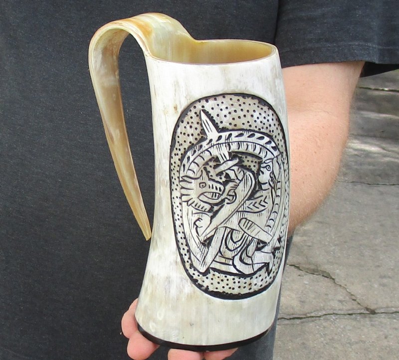 Polished Carved Buffalo Horn Mug, Cow Horn Mug with fighting knight and dragon design measuring approximately 7-1/4 inches tall, measured from the base of the mug to the top of rim opposite the handle. review photos.  This natural Buffalo Horn Mug, Cow Horn Mug is made using traditional methods which make an excellent re-enactment piece. The exterior has been hand polished and includes a horn handle. These mugs make a beautiful display item and while they hold liquid, we do not recommend drinking from them. The item will have a slight odor and may have minor scratches due to buffing and the natural material used. The variations in shape and color can only be made by nature; thus a horn may have natural blemishes which will not affect its use, but does verify its authenticity.