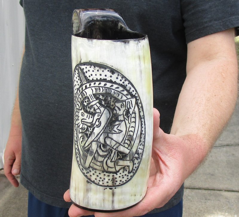 Polished Carved Buffalo Horn Mug, Cow Horn Mug with fighting knight and dragon design measuring approximately 7 inches tall, measured from the base of the mug to the top of rim opposite the handle. review photos.  This natural Buffalo Horn Mug, Cow Horn Mug is made using traditional methods which make an excellent re-enactment piece. The exterior has been hand polished and includes a horn handle. These mugs make a beautiful display item and while they hold liquid, we do not recommend drinking from them. The item will have a slight odor and may have minor scratches due to buffing and the natural material used. The variations in shape and color can only be made by nature; thus a horn may have natural blemishes which will not affect its use, but does verify its authenticity.