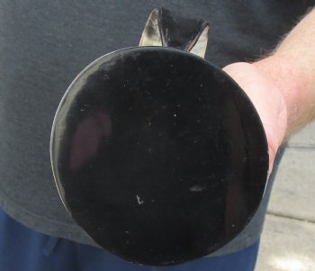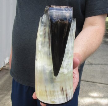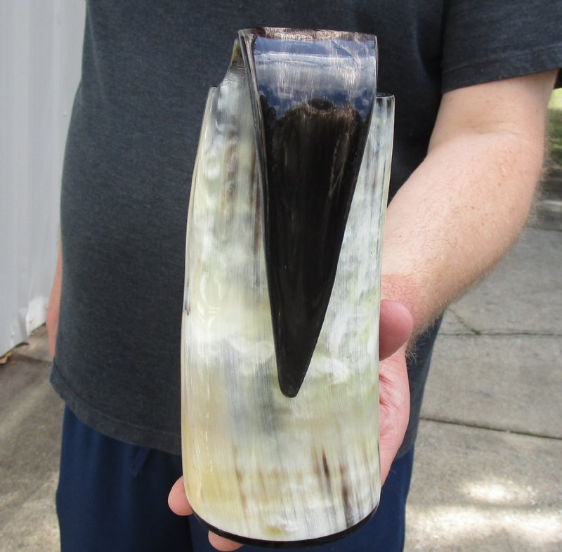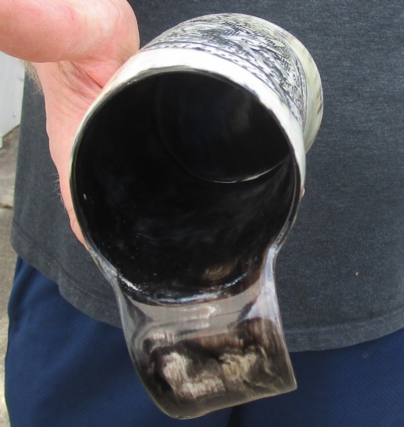 Polished Buffalo Horn Mug, Cow Horn Mug with carved design 7 inches tall. Available for sale for $15
