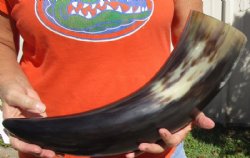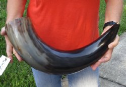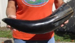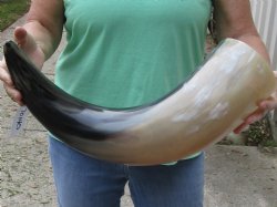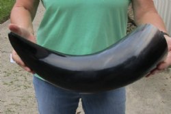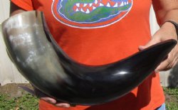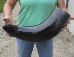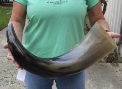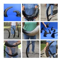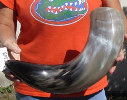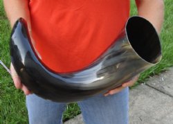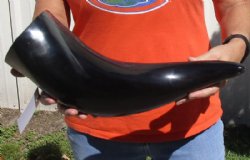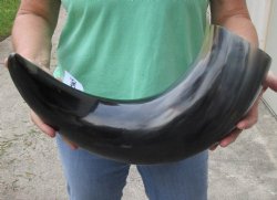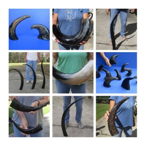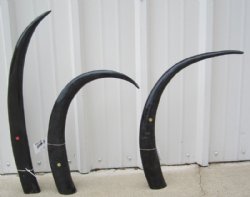 Shop our vast assortment of hand picked and wholesale polished and semi polished buffalo horns for sale, imported from India, hand selected and photographed allowing our customers to see exactly what they are buying. You can purchase these polished and semi polished water buffalo horns in sizes ranging 6 inches up to 30 plus inches tall. Our extra large black polished buffalo horns are up to 45 inches tall. Some stand on their own, while others need support. We sell them individually and in 2 piece, 5 piece and 10 piece lots for horn crafts and carving horn. Our water buffalo horns will vary in color, shape and size and are used for cabin decor, rustic decorating, in making knife and cane handles, for carving, making animal horn jewelry and in making inlaid instruments. The horns are measured around the curve of the horn with a cloth tape measure NOT straight with a wood ruler. Some of these horns have a tiny patch at the tip of the horn where a whole was drilled to release the pressure and allow the inner bone to be removed.
