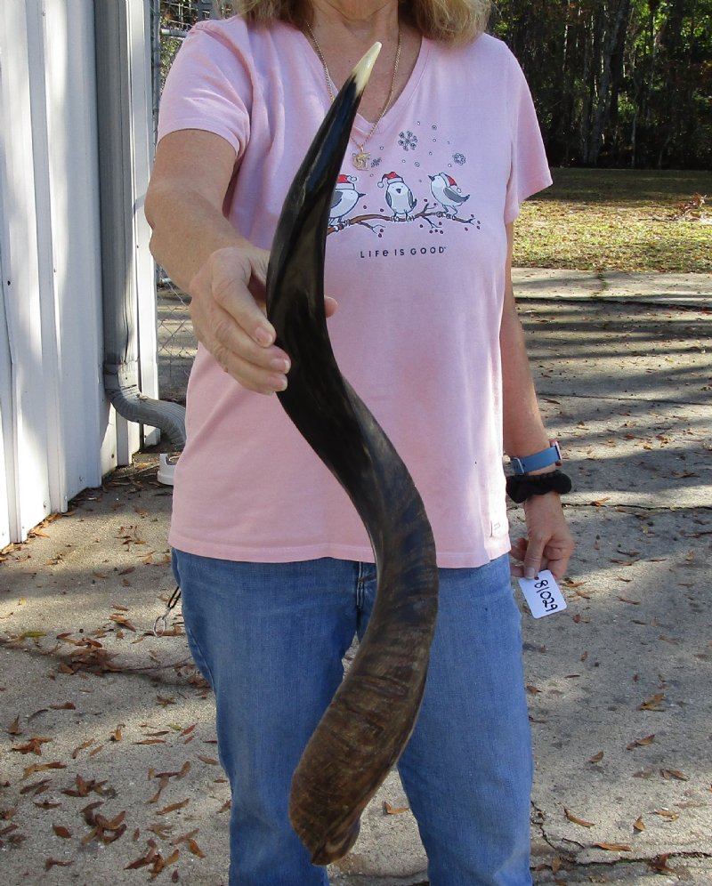 Polished Kudu horn for sale (Tragelaphus strepsiceros / Greater Kudu) imported from South Africa, measuring approximately 29 inch, measured around the curl of the horn - not straight.   review photos. Kudu horns are used in making shofars, blowing horns, kudu horn instruments, furniture legs, lamps, sconces, knife handles, cane handles, inlaid crafts and numerous other taxidermy crafts. Our African kudu horns are by-products of the farming industry and the African Government culling programs. The kudu horns have been professionally cleaned in Africa and cleared for entry into the United States by the U.S. Fish and Wildlife Service and U.S. Customs. We are direct importers of African wildlife products and have all Federal and State licenses.
