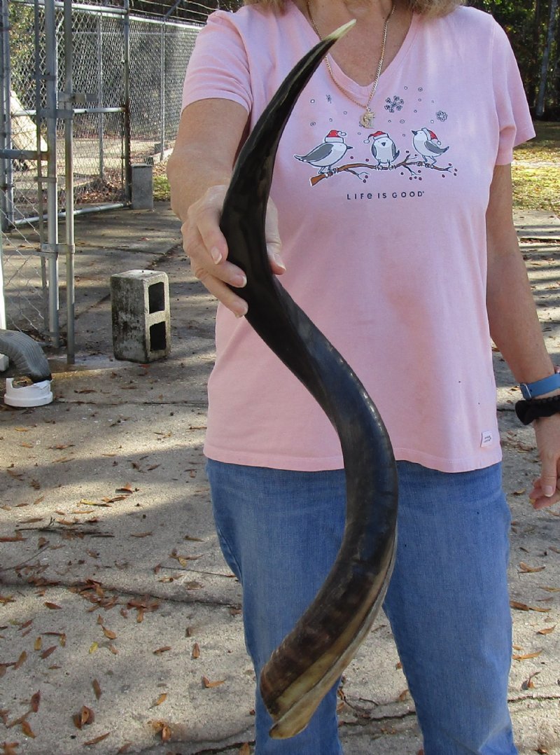 Polished Kudu horn for sale (Tragelaphus strepsiceros / Greater Kudu) imported from South Africa, measuring approximately 32 inch, measured around the curl of the horn - not straight.   review photos. Kudu horns are used in making shofars, blowing horns, kudu horn instruments, furniture legs, lamps, sconces, knife handles, cane handles, inlaid crafts and numerous other taxidermy crafts. Our African kudu horns are by-products of the farming industry and the African Government culling programs. The kudu horns have been professionally cleaned in Africa and cleared for entry into the United States by the U.S. Fish and Wildlife Service and U.S. Customs. We are direct importers of African wildlife products and have all Federal and State licenses.