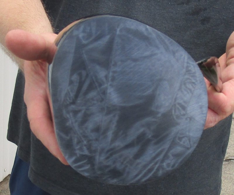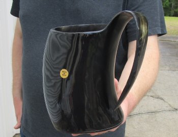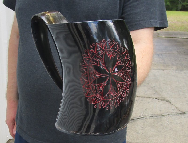 Polished Ox Horn Mug, Cow Horn Mug with an Carved Red Emblem design measuring approximately 7 inches tall, measured from the base of the mug to the top of rim opposite the handle.  This natural Ox Horn Mug, Cow Horn Mug is made using traditional methods which make an excellent re-enactment piece. The exterior has been hand polished and includes a horn handle. These mugs make a beautiful display item and while they hold liquid, we do not recommend drinking from them. The item will have a slight odor and may have minor scratches due to buffing and the natural material used. The variations in shape and color can only be made by nature; thus a horn may have natural blemishes which will not affect its use, but does verify its authenticity.