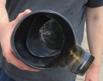 Polished Ox Horn Mug, Cow Horn Mug with carved red emblem design 7" tall - $15