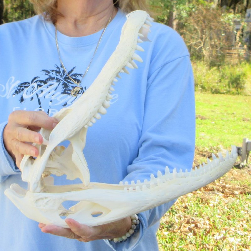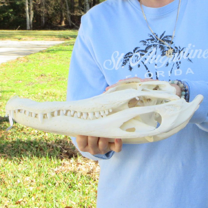 Florida Alligator Skull (Alligator mississippiensis) measuring approximately 15 inches long and 6 inches wide and is from an estimated 7 foot Florida alligator.  The alligator skull has been beetle cleaned and whitened. Danage to back of skull. Review photos.  It is a real gator skull - NOT a replica, and will have some natural blemishes, cartilage and chipped or missing teeth from living in the wild and fighting.