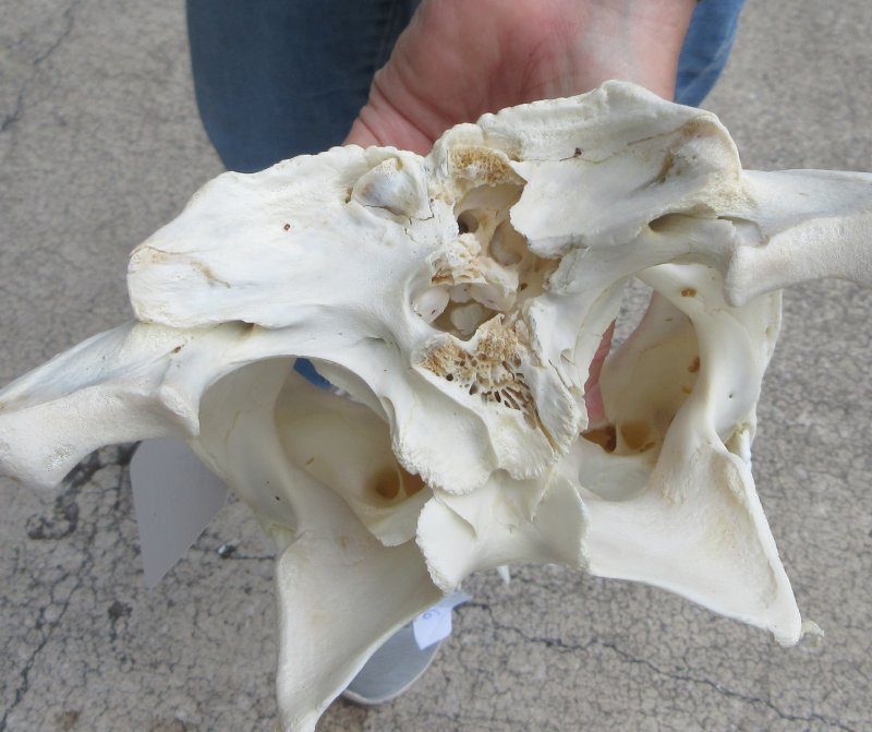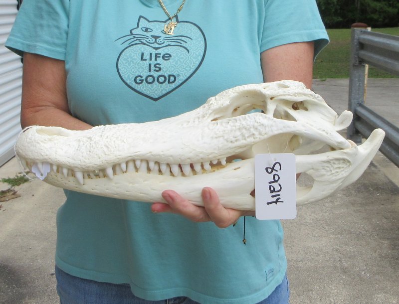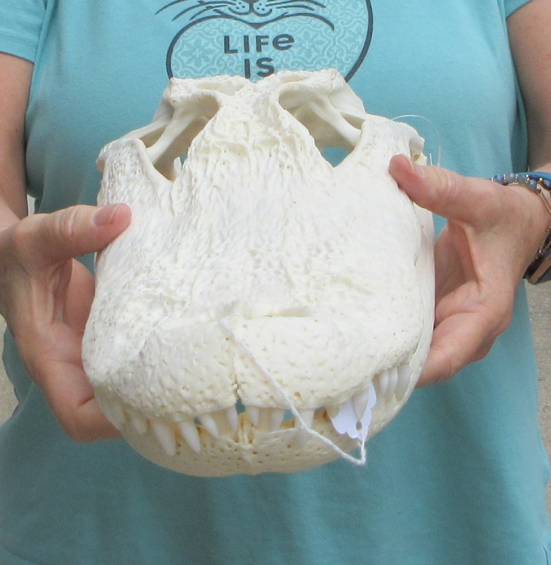 Florida Alligator Skull (Alligator mississippiensis) measuring approximately 16-1/2 inches long and 7 inches wide and is from an estimated 8 foot Florida alligator.  The alligator skull has been beetle cleaned and whitened.  Missing teeth, cartilage in teeth, and damage to back of skull. Review photos.  It is a real gator skull - NOT a replica, and will have some natural blemishes, cartilage and chipped or missing teeth from living in the wild and fighting.
