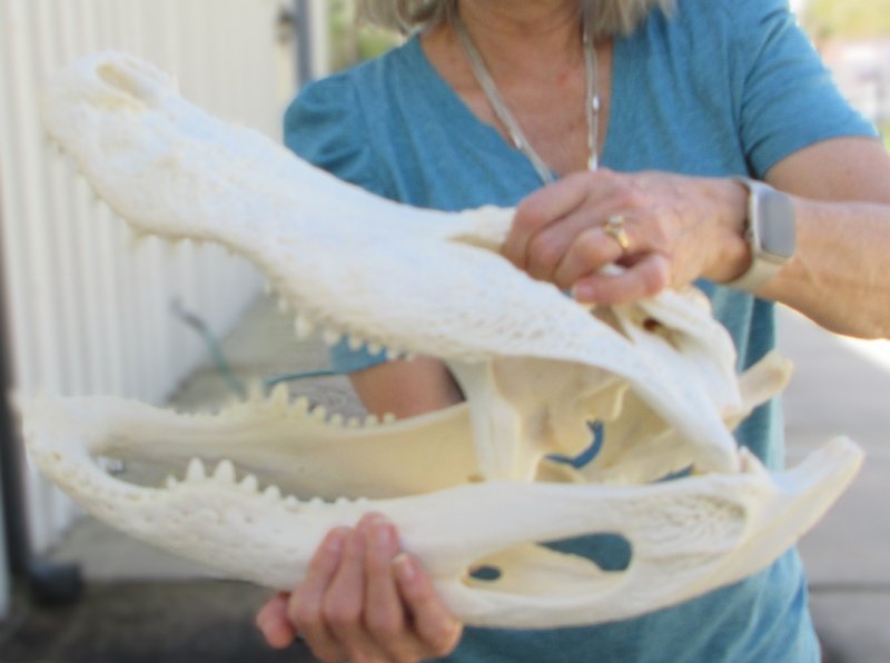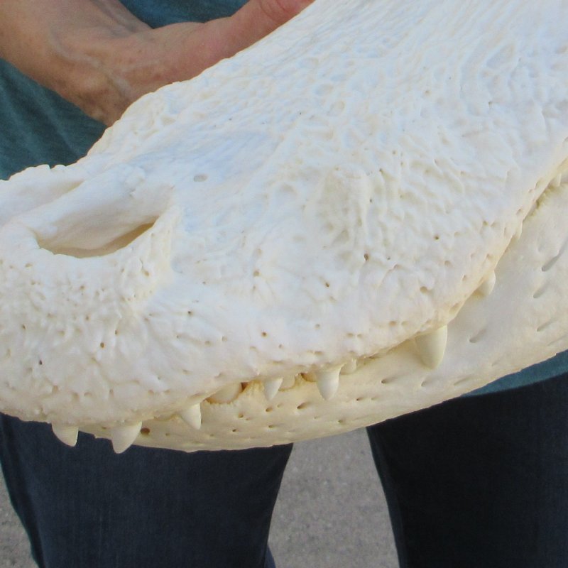 Florida Alligator Skull (Alligator mississippiensis) measuring approximately 18 inches long and 8-1/2 inches wide and is from an estimated 9 foot Florida alligator.  The alligator skull has been beetle cleaned and whitened.  Cartilage in teeth, pathology twisted snout, crack in back on skull, and missing teeth. Review photos.  It is a real gator skull - NOT a replica, and will have some natural blemishes, cartilage and chipped or missing teeth from living in the wild and fighting.