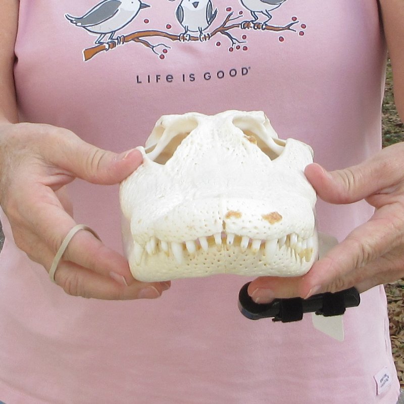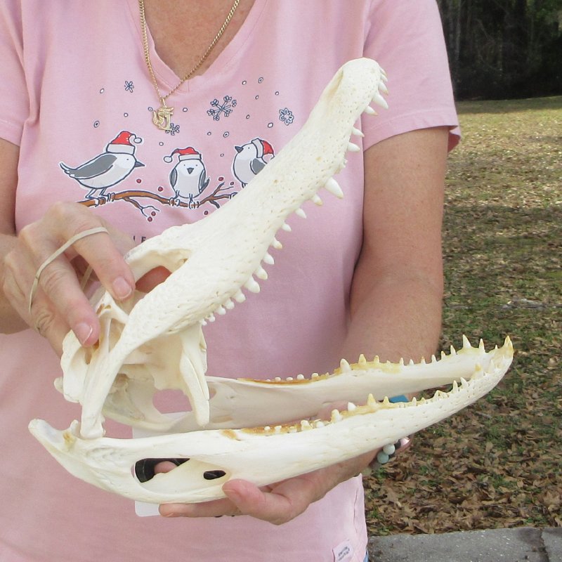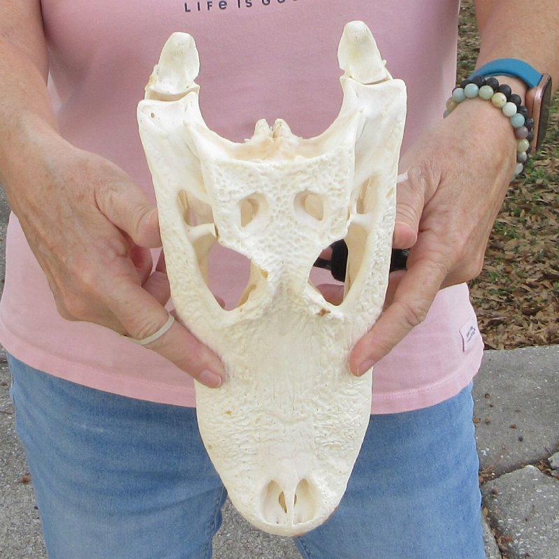 Florida Alligator Skull (Alligator mississippiensis) measuring approximately 12 inches long and 5-1/2 inches wide and is from an estimated 6 foot Florida alligator.  The alligator skull has been beetle cleaned and whitened  - Damage to back of skull. Review photos.  It is a real gator skull - NOT a replica, and will have some natural blemishes, cartilage and chipped or missing teeth from living in the wild and fighting.