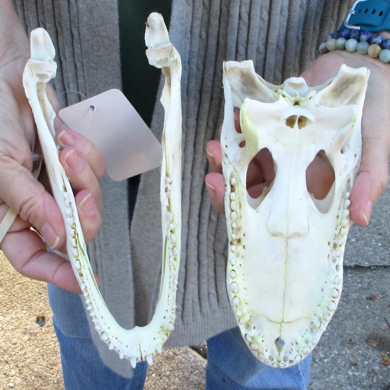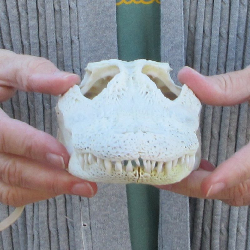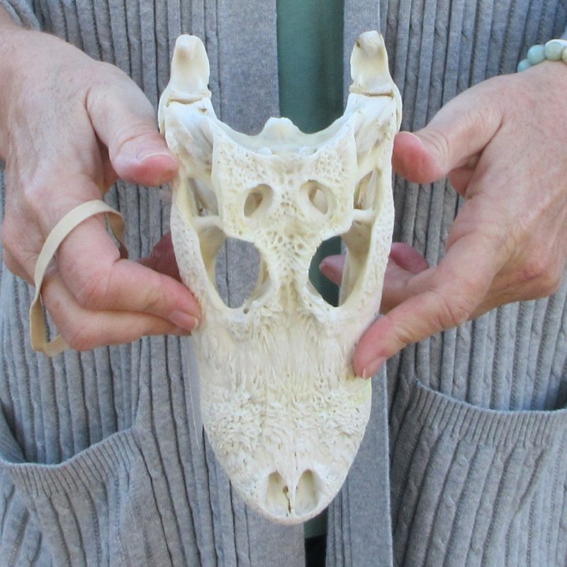Florida Alligator Skull (Alligator mississippiensis) measuring approximately 8-1/2 inches long and 3-1/2 inches wide and is from an estimated 4 foot Florida alligator.    Yellow tint to skull. - Review all photos. The alligator skull has been cleaned and whitened.  It is a real gator skull - NOT a replica, and will have some natural blemishes, cartilage and chipped or missing teeth from living in the wild and fighting.