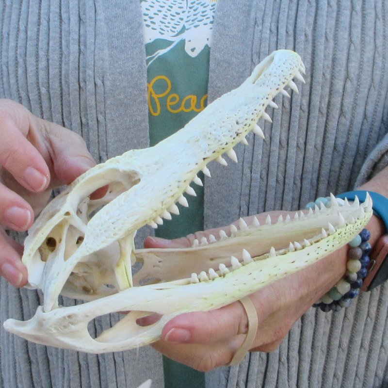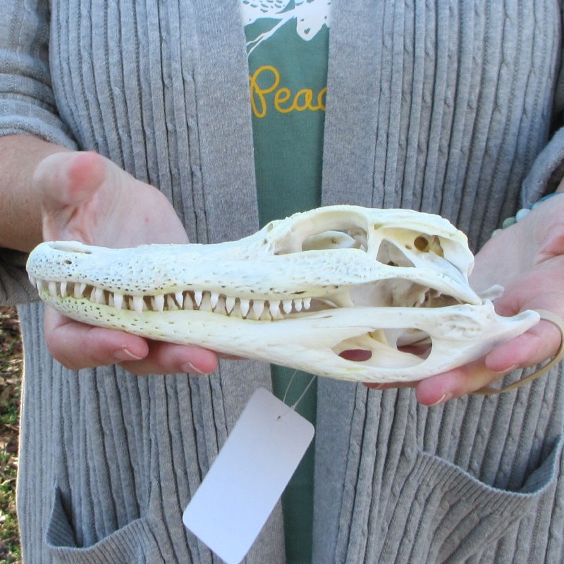 Florida Alligator Skull (Alligator mississippiensis) measuring approximately 8-1/2 inches long and 3-1/2 inches wide and is from an estimated 4 foot Florida alligator.    Yellow tint to skull. - Review all photos. The alligator skull has been cleaned and whitened.  It is a real gator skull - NOT a replica, and will have some natural blemishes, cartilage and chipped or missing teeth from living in the wild and fighting.