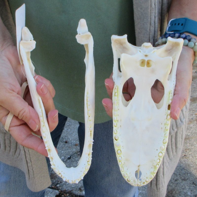 Florida Alligator Skull (Alligator mississippiensis) measuring approximately 9 inches long and 3-1/2 inches wide and is from an estimated 4 foot Florida alligator.    Yellow tint to skull. - Review all photos. The alligator skull has been cleaned and whitened.  It is a real gator skull - NOT a replica, and will have some natural blemishes, cartilage and chipped or missing teeth from living in the wild and fighting.