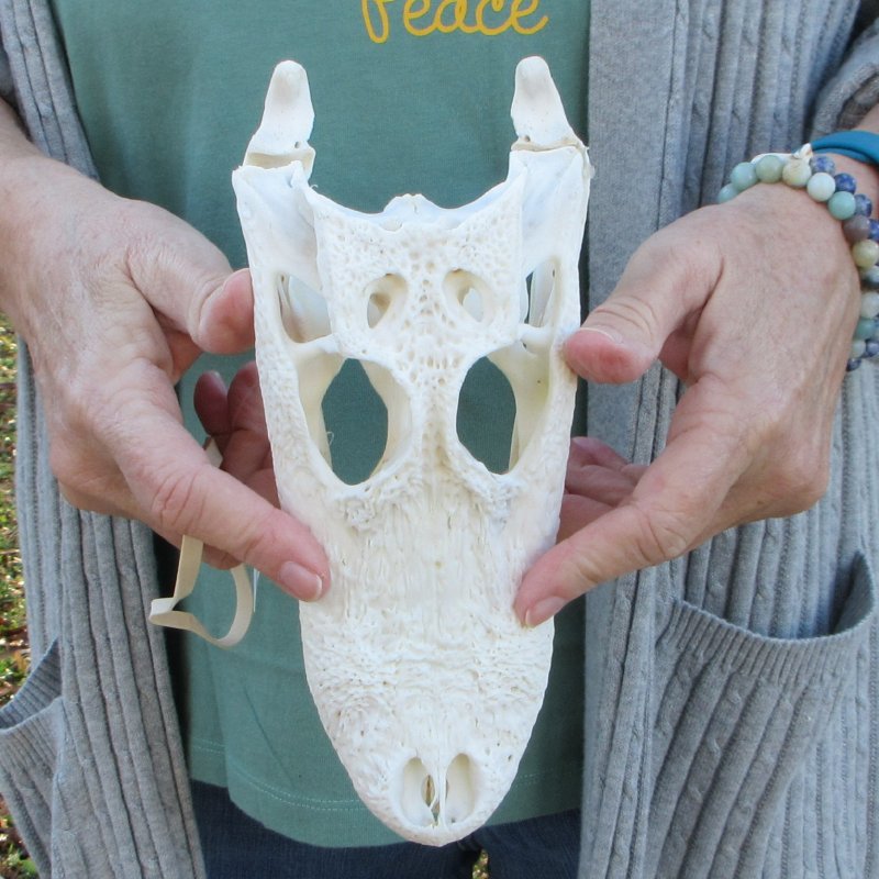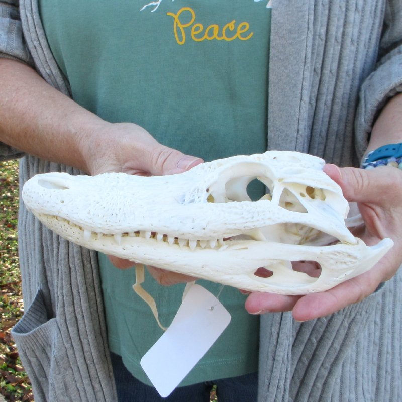 Florida Alligator Skull (Alligator mississippiensis) measuring approximately 9 inches long and 3-1/2 inches wide and is from an estimated 4 foot Florida alligator.    Yellow tint to skull. - Review all photos. The alligator skull has been cleaned and whitened.  It is a real gator skull - NOT a replica, and will have some natural blemishes, cartilage and chipped or missing teeth from living in the wild and fighting.