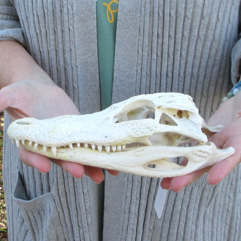 Florida Alligator Skull (Alligator mississippiensis) measuring approximately 9 inches long and 3-1/2 inches wide and is from an estimated 4 foot Florida alligator.    Yellow tint to skull. - Review all photos. The alligator skull has been cleaned and whitened.  It is a real gator skull - NOT a replica, and will have some natural blemishes, cartilage and chipped or missing teeth from living in the wild and fighting.