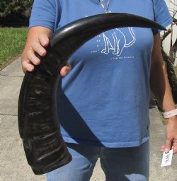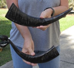 The horns are measured around the curve of the horn with a cloth tape measure NOT straight with a wood ruler.  Some of these horns have a tiny patch at the tip of the horn where a hole was drilled to release the pressure and allow the inner bone to be removed.  These are real horns -- NOT replicas.  They will have natural imperfections -- scars, indentations, blemishes, etc.  These are nice horns.
