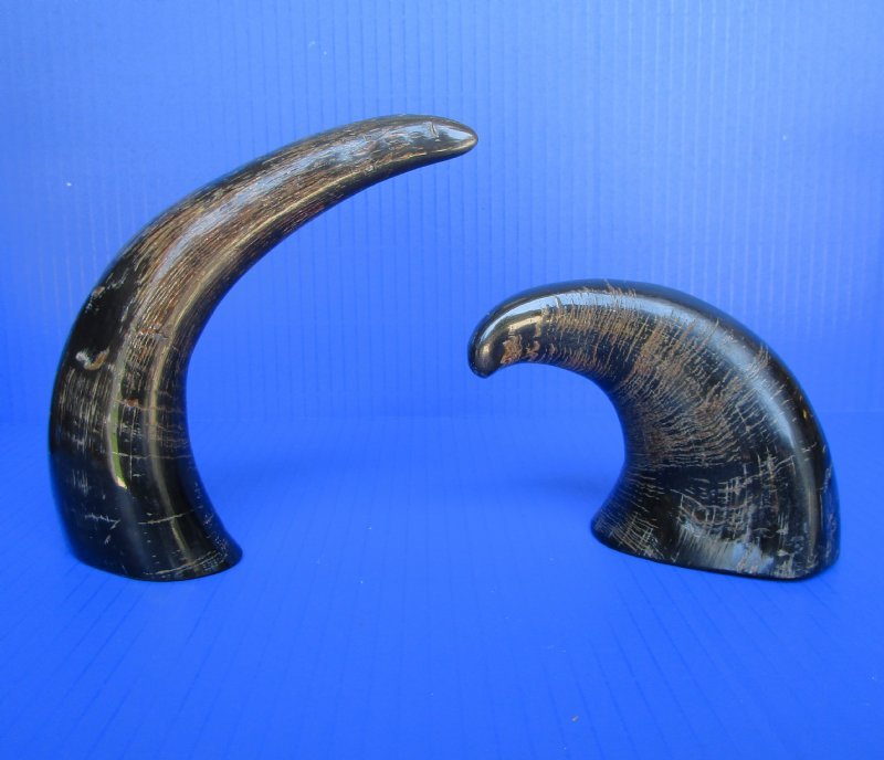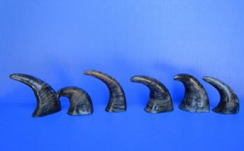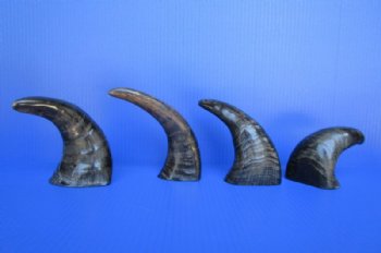 Semi-polished Indian water buffalo horns wholesale, Bubalus bubalis, 6 inches to 8 inches, are measured around the curve of the horn using a cloth tape measure. These horns are NOT fully polished. Semi-polished buffalo horns vary in coloring, size and shape and are used for making animal horn jewelry, in cabin decor, rustic decorating, in making knife and cane handles, for carving, in the art of scrimshaw and in making inlaid instruments.