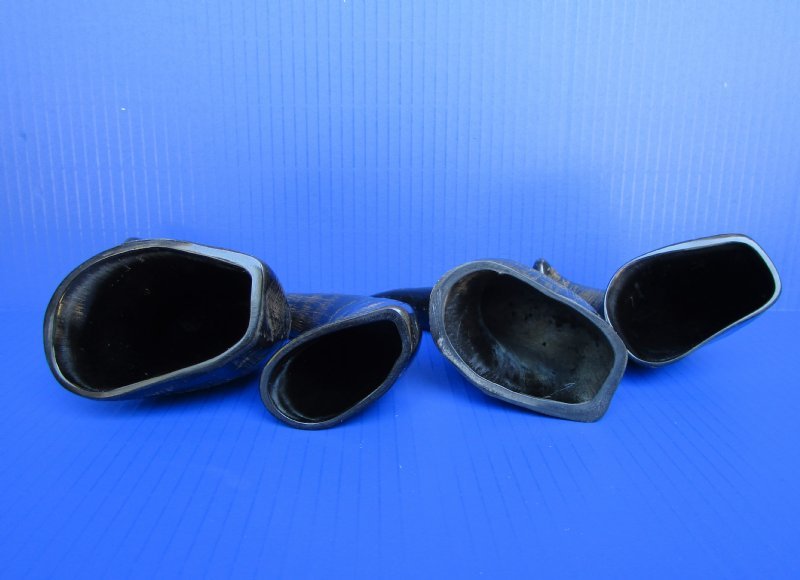 You will receive horns similiar to those shown in the photo. No two horns are identical. They will vary in coloring, shading and size. These horns are measured around the curve of the horn using a cloth tape measure -- NOT straight with a wood ruler. Some of these horns have a tiny patch at the tip of the horn where a tiny hole was drilled to release the pressure and allow removal of the inner bone.
